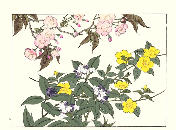 7 Weeping forsythia (Forsythia suspensa), violet (Viola verecunda), buttercup (Ranunculus sp.) and violet (Viola eizanensis)