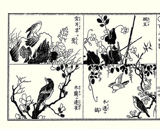 19 Left – Japanese kerria (Kerria japonica) and Java sparrow (Padda oryzivora); Middle – Japanese wisteria (Wisteria floribunda) and common hill myna (Gracula religiosa); Right – dandelion (Taraxacum sp.) and skylark (Alauda arvensis)
