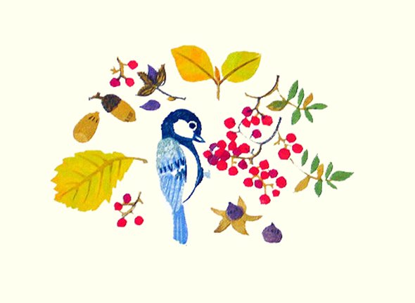 17 Heavenly bamboo (Nandina domestica), oak (Quercus sp.), Japanese beech (Fagus crenata), Japanese chestnut (Castanea crenata) and Eurasian jay (Garrulus glandarius)