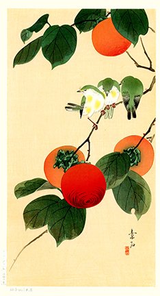 SK1 Japanese persimmon (Diospyros kaki) and Japanese white-eye (Zosterops japonicus) by Soseki Komori (active early 1900s), woodblock