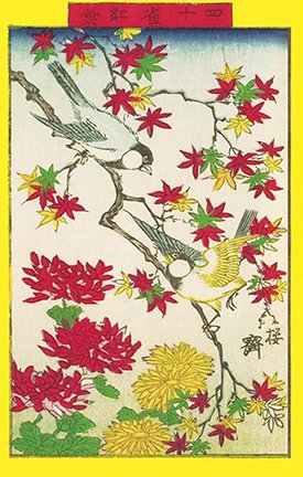 20 Camellia (Camellia japonica), scabrous gentian (Gentiana scabra) and brown-headed thrush (Turdus chrysolaus)