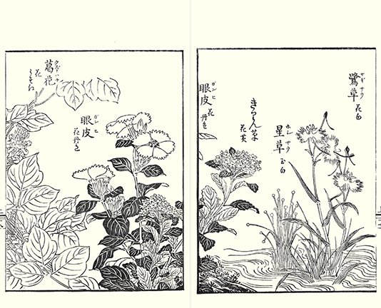 14 Chinese trumpet-creeper (Campsis grandiflora), cardiandra (Cardiandra alternifolia), Canterbury-bells (Campanula medium), wind orchid (Neofinetia falcata), gooseneck loosestrife (Lysimachia clethroides) and Japanese glorybower (Clerodendrum japonicum)