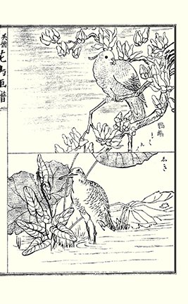 2 Japanese wisteria (Wisteria floribunda), bull-headed shrike (Lanius bucephalus), goldcrest (Regulus regulus), Ryūkyū robin (Erithacus komadori), willow tit (Poecile montanus) and gray wagtail (Motacilla cinerea)