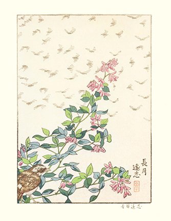 7 Weeping forsythia (Forsythia suspensa) and red-flanked bluetail (Tarsiger cyanurus)
