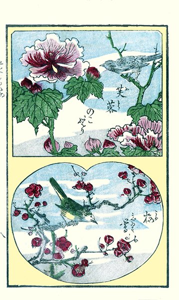 14 Top – Asiatic dayflower (Commelina communis) and Japanese grosbeak (Eophona personata); Bottom – water-lily (Nuphar japonicum) and narcissus flycatcher (Ficedula narcissina)