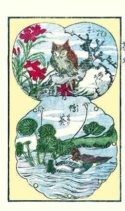 5 Top – florist’s chrysanthemum (Chrysanthemum grandiflorum), monochoria (Monochoris korsakowii) and mandarin duck (Aix galericulata); Bottom – strawberry (Fragaria sp.) and unknown birds