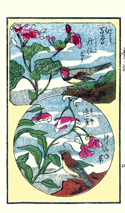7 Top – kudzu (Pueraria lobata) and green pheasant (Phasianus versicolor); Bottom – tree peony (Paeonia suffruticosa) and bull-headed shrike (Lanius bucephalus)