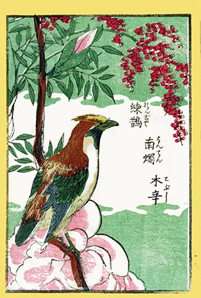 26 Chinese trumpet-creeper (Campsis grandiflora) and cirl bunting (Emberiza cirlus)
