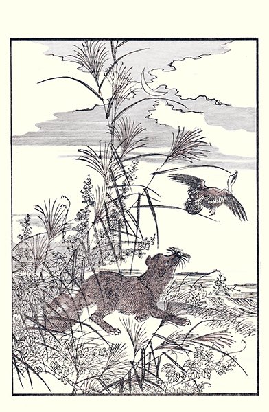 7 Left – Japanese kerria (Kerria japonica), mallard duck (Anas platyrhynchos), green-winged teal (Anas crecca) and white-fronted goose (Anser albifrons); Right – water-lily (Nuphar japonicum), cotton-rose (Hibiscus mutabilis), eulalia grass (Miscanthus sinensis), hawk (Accipiter sp.) and green pheasant (Phasianus versicolor)