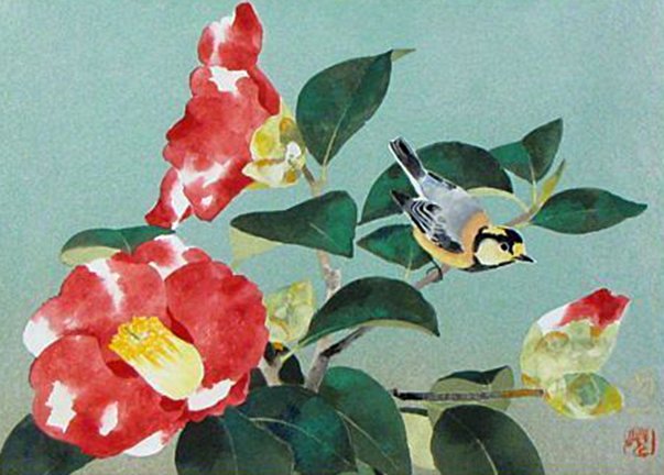 24 Japanese kerria (Kerria japonica) and varied tit (Sittiparus varius)