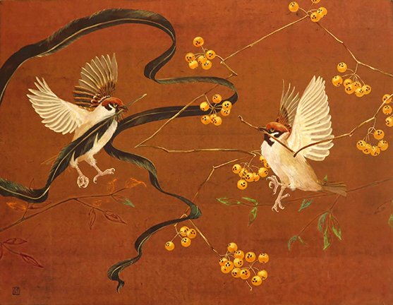 6 Mimosa (Acacia dealbata) and Eurasian tree sparrow (Passer montanus)