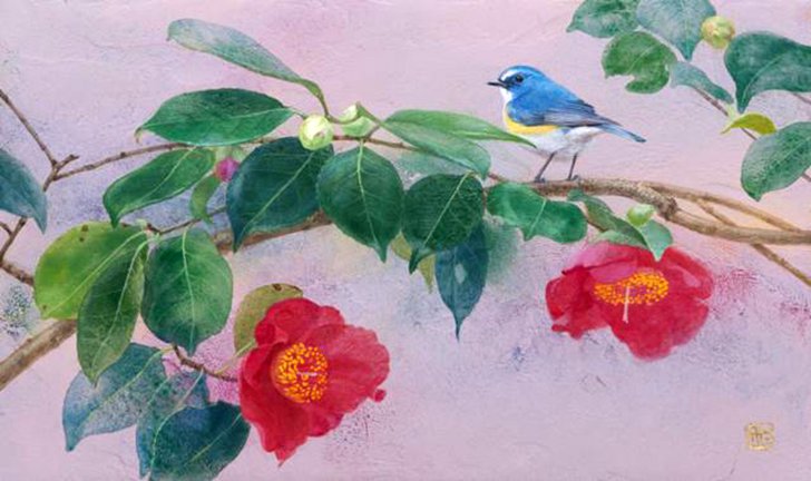 123 Camellia (Camellia japonica) and red-flanked bluetail (Tarsiger cyanurus)