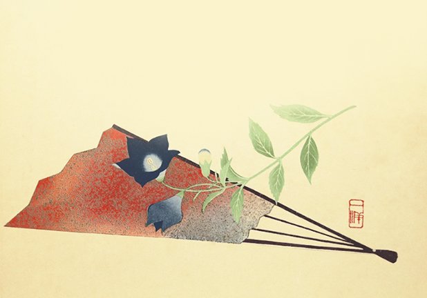 1 Eggplant (Solanum melongena) and chameleon-plant (Houttuynia cordata) by Chikkyō Ono (1889-1979), woodblock, 335 x 240 mm