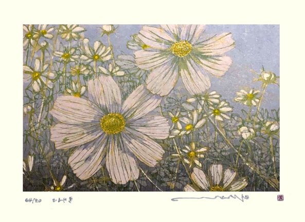 48 Camellia (Camellia japonica) by Miwako Iwasaki (1957-), woodblock